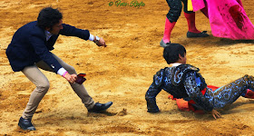 El primero que llegó al quite fue Pérez Mota, valentísimo, que presenciaba la corrida desde el callejón. Véanlo intentando ayudar ¿qué lleva en la mano, el móvil?