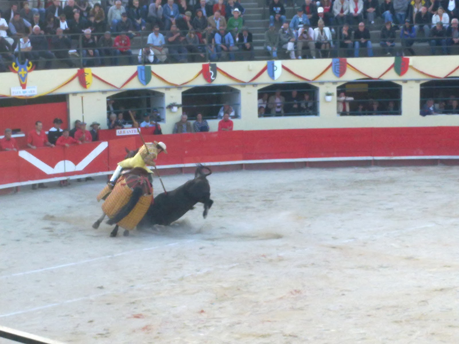 Por una vez, los de luces no tienen la culpa, hicieron todo lo posible para lucir unos toros que suelen darlo todo en el caballo, y  si alguna complicacion tienen, es en la muleta. Estos de Alès, ni eso. Lo que tenian era una debilidad y una soseria desesperantes. Tampoco tenian nobleza, y claro, los toreros no se podian descuidar, pero no hubo ninguno, con la excepcion del negro sexto, que realmente sacò algun peligro. Embestian a media altura, perdian las manos, se caian, se quedaban parados. Alguno preferia levantar las tablas de la barrera que acudir a capotes y muletas.