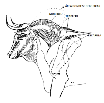 La teoría ya la sabemos todos: si el toro tiene tendencia a echar la cara arriba, se pica delantero y si es al revés, un poco más atrás pero siempre sin rebasar esa segunda vértebra cervical que nos indicaba Heredia en su dibujo. Este novillo de Prieto de la Cal fue picado adecuadamente en ese sitio en Andorra, no hay queja: