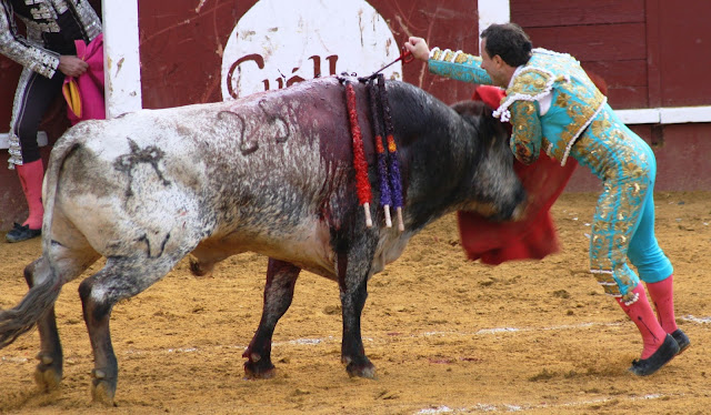 Recuerden lo que comentábamos aquí sobre la forma de entrar a matar. Al final, casi entera pasada y la oreja que tenía ganada a pesar del nefasto primer tercio que nos brindó, se diluyó como azucarillo. Pero conste que fue culpa suya por ese error garrafal al matar.