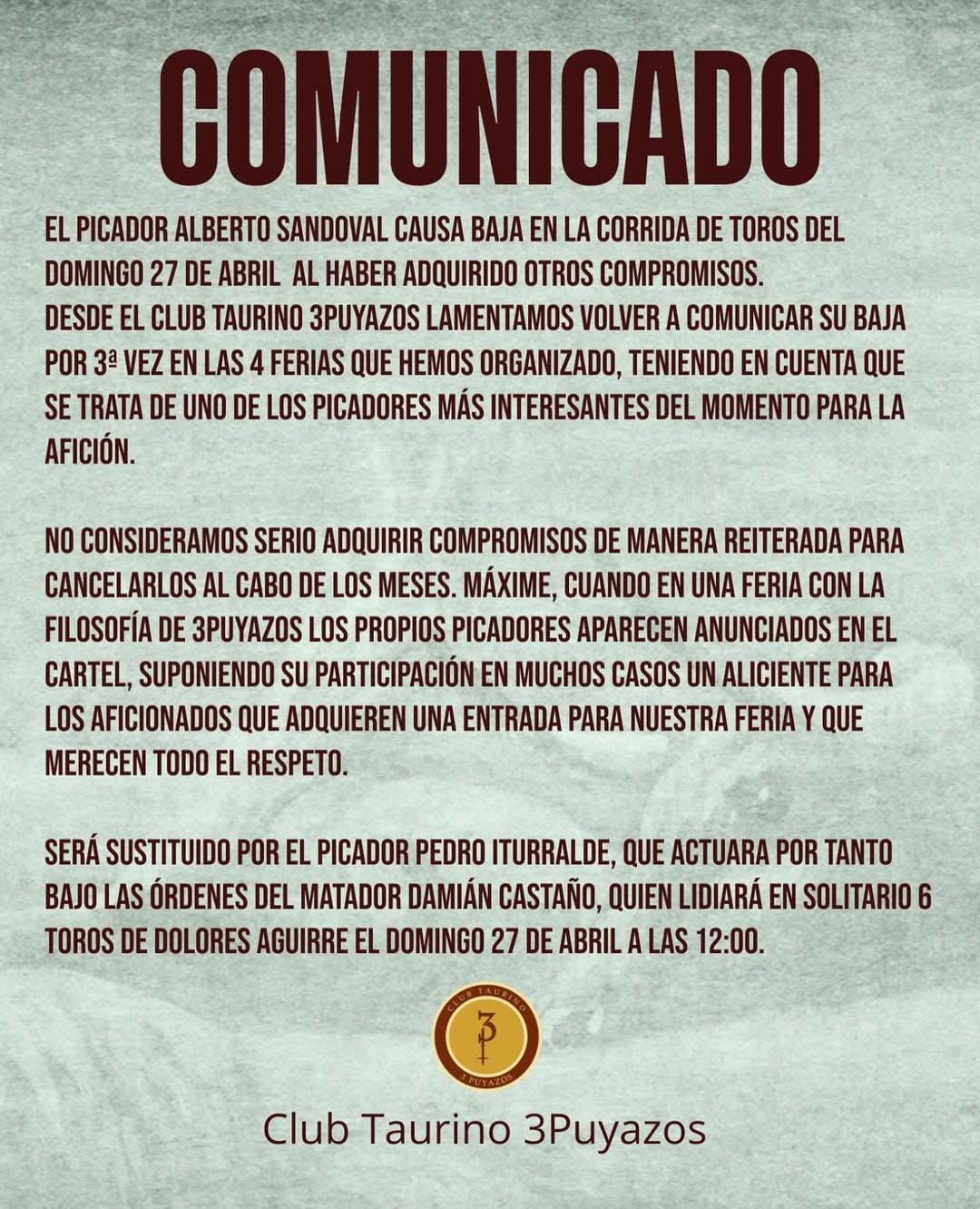 Dicen que va a venir a 3Puyazos en sustitución de Sandoval pequeño, quien prefiere ganar más dinero picando novilletes con Pérez el mismo día antes que pasar miedo con los aguirres. Esperemos que Iturralde se comporte con más respeto en Guadalix que el demostrado ayer en Madrid. Por cierto, este comunicado del club anunciando la ausencia de Sandoval, tan educado como verídico, ha sido muy mal recibido por el colectivo de La Puya Nostra: